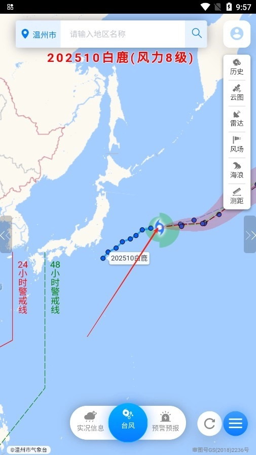 3、然后点击上面的小点,就可以查看台风的路线了。
