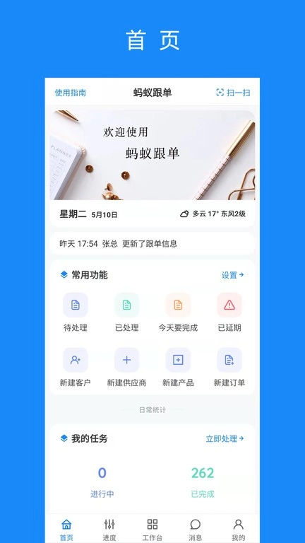 蚂蚁跟单最新版本是一款专门面向生产型企业打造的移动端跟单管理应用,借助手机就能高效追踪订单的完整流程。这款软件支持多个角色协同工作,工厂员工可以实时更新生产进度节点,管理人员能够清楚了解打样、报价、订单执行等重要环节的情况;客户也能够自行查询产品的生产进度,从而降低沟通方面的成本。系统运用了可视化的界面设计,配备智能预警功能,会自动标记出现延误的任务,保证每个环节都能按时推进。现在就来体验智能跟单服务吧,感兴趣的话欢迎尝试。