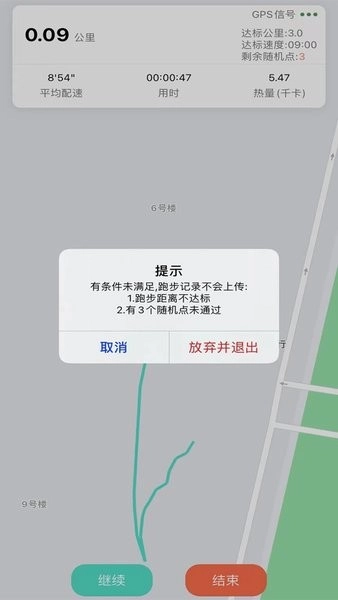 完成跑步:长按暂停键后点击结束,未达标数据不会保存;