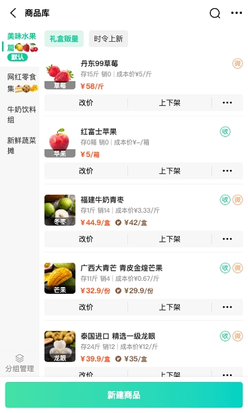 - 可通过移动端随时对商品信息进行调整,涵盖果蔬品类、价格策略以及上下架状态等内容;