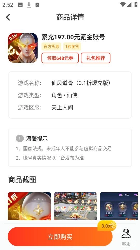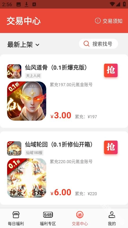4、再接着点击下方的“交易中心”,可以看到最新上架的游戏账号。