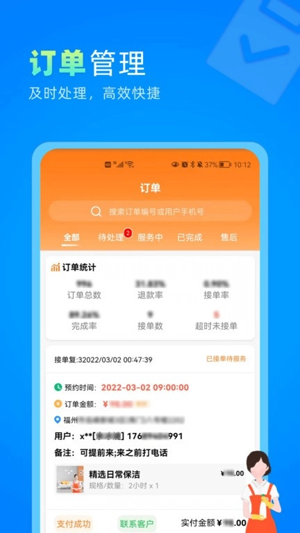 数据实时更新,精准呈现店铺运营实况;消息即时推送,保障与客户的高效沟通;订单状态全程追踪,服务进度尽在掌握;收入明细清晰记录,盈利状况一目了然;服务项目自主管控,经营策略灵活调整;移动办公不受时空限制,商机把握分秒不怠。
