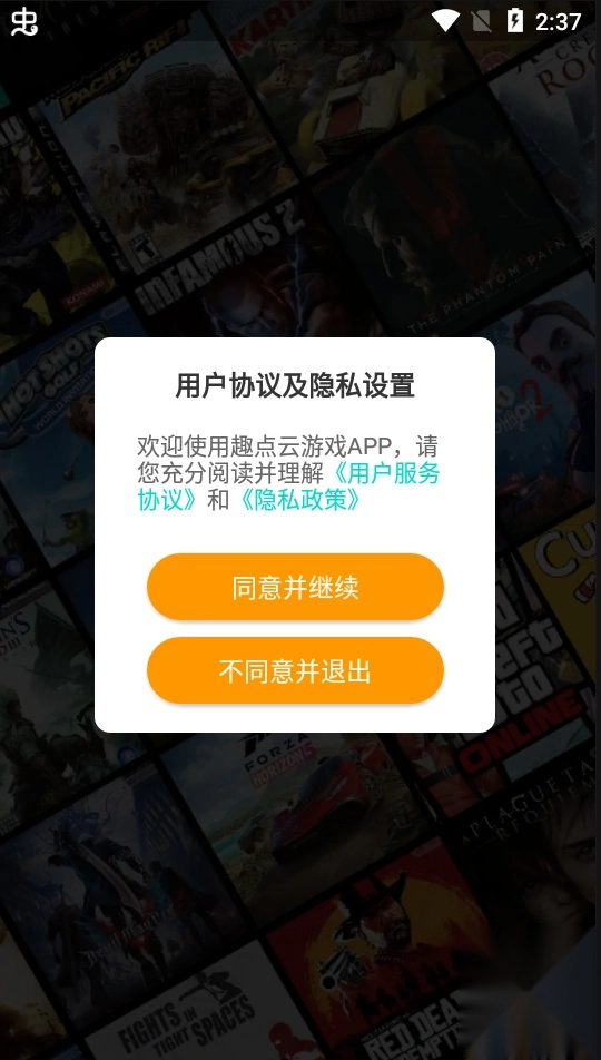 1、安装好趣点云游戏,运行软件,同意用户协议和隐私设置;