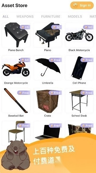 1、提供超200种风格化道具资源包,覆盖校园用品、奇幻武器等多种类别,其中部分道具需使用袋熊币解锁;
