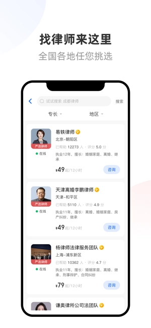 我们运用多维评估体系,结合专业领域、胜诉率、用户评价等数据进行智能推荐,同时支持按地域、资历、价格等条件筛选。