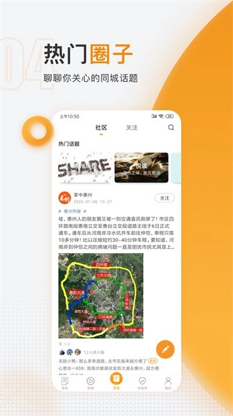 - 同城话题社区活跃度高,热门帖子实时互动讨论;