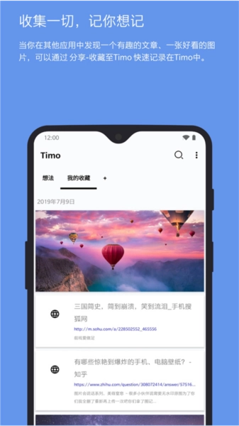 当用户在其他应用中看到自己想要保存的内容时,可以通过“分享-保存到Timo”的方式方便快捷地保存到Timo中,自己想要保存的东西不会掉下来。