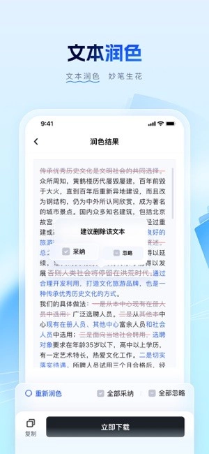 智能检测系统可精准识别错别字、语法错误以及涉政问题。具备专业的公文风格润色能力,助力表达更趋规范得体。操作简单易用,支持一键采纳或忽略相关修改建议。