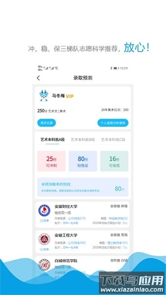 根据个人成绩和在全省的排名情况,智能生成可冲刺、较稳妥、有保底的三档院校推荐列表。