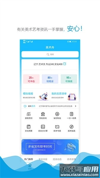 美术舟是一款面向美术生打造的智能服务平台,集课程学习、志愿填报、行业资讯等核心功能于一体。借助简洁的界面与高效的搜索系统,用户能迅速定位所需信息,无论是备考资料还是院校动态都可轻松获取;平台运用大数据分析技术,为考生提供精准的志愿填报指导,同时实时更新各省艺术类招生政策。画室推荐、成绩评估等实用工具应有尽有,搭配动画课程和阶段测评,让学习过程更高效且富有趣味。若你正在寻觅专业的美术升学辅助工具,不妨即刻体验。