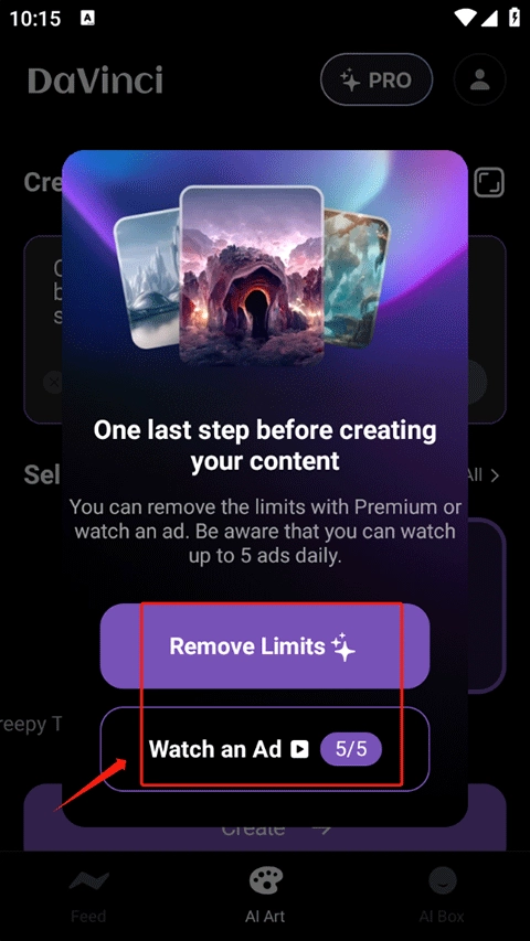 4、若你已充值会员,可点击Remove Limits进行生成;若未充值,则点击下方的观看广告来获取。