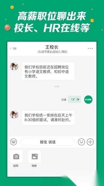 2. 支持文字、语音、视频等多种沟通形式,教师和校长能够直接商定试讲时间。