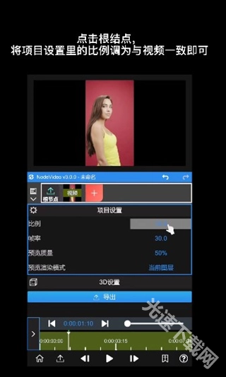 6、特别需要注意的是,我们导入的视频比例与画布比例不符,所以两边有黑边,只需点击根结点将项目设置的比例调为与视频一致即可