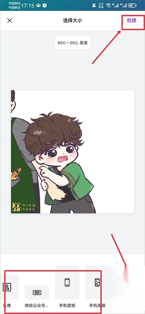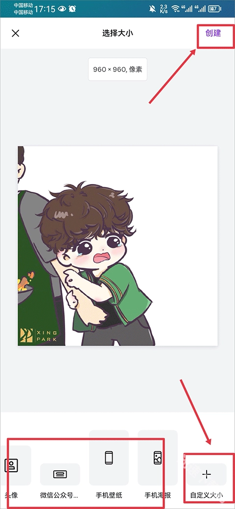 3、在相册中选择照片后,接着选择图片的大小,若下方大小不合适时,可以点击自定义大小,大小选择完成后点击创建即可