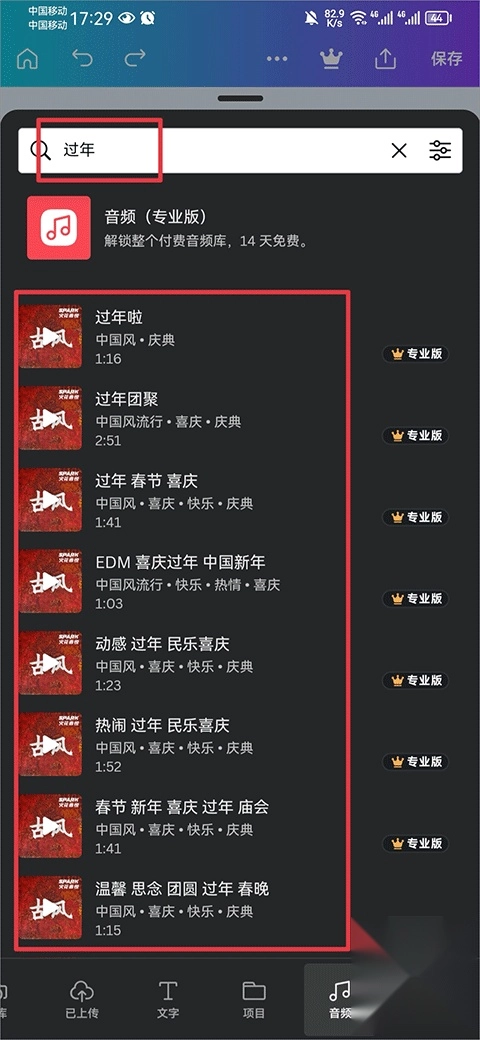 2、进入音频界面后,搜索音频类型并选择合适的音频进行添加即可