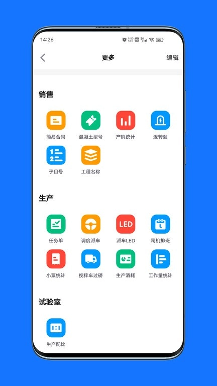 生产模块涵盖任务单创建、LED屏派车指令推送、司机考勤记录等功能;销售模块可实现退转剩混凝土自动折算、工程分级管理、快捷合同生成等操作;质检员能够随时调取配比参数,司机端则能实时接收装卸料导航定位信息。