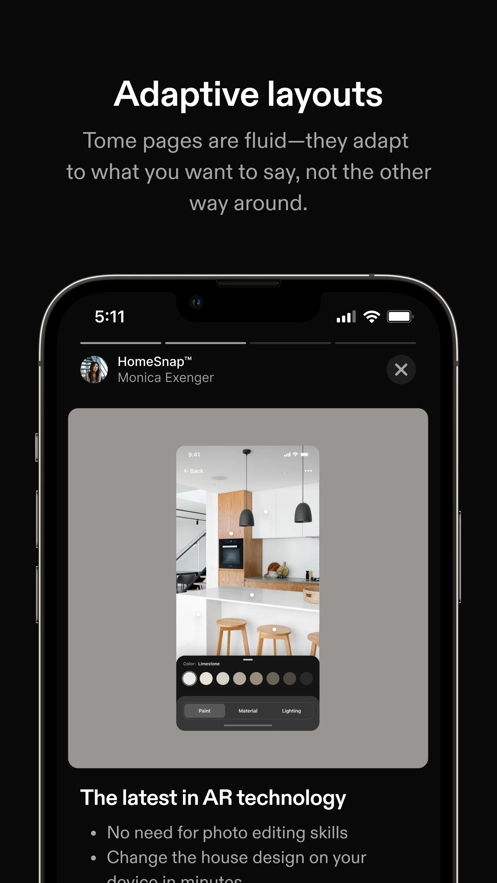 专注于您的想法,Tome 将处理其余部分。拖放式创建、响应式页面以及一键式主题意味着您无需花费时间来调整内容或应用品牌颜色。