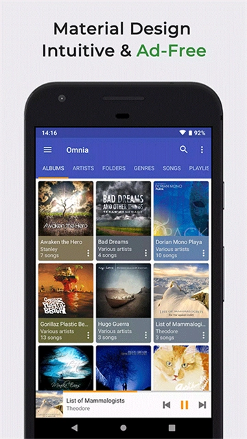 2. 按专辑、艺术家、文件夹和流派等类别管理和播放音乐。