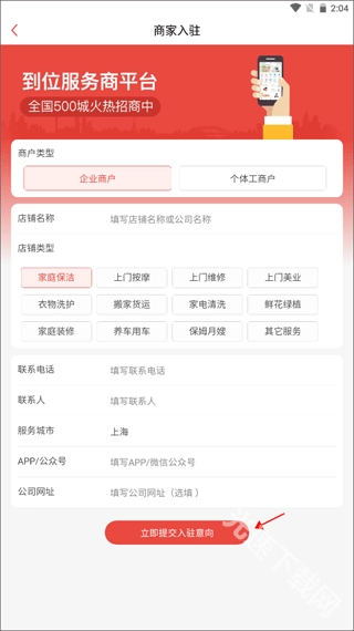 2、选择商户的类型,输入基本信息等,最后点击“立即提交入驻意向”即可入驻成功。