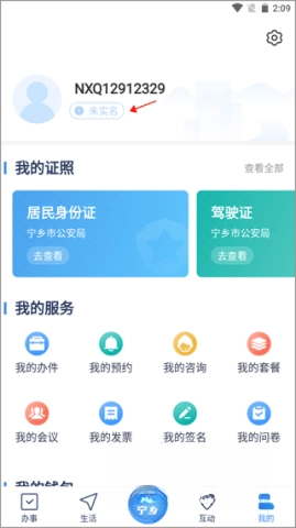 进入智慧宁乡平台后,点击进入个人中心页面,就能便捷地找到“未实名”相关按钮。