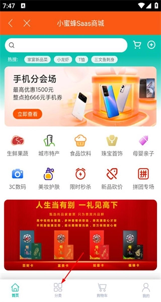 1、打开首页后,找到底部的分类按钮并点击,接着浏览各个商品分区,同时查看手机会场之类的促销活动内容。