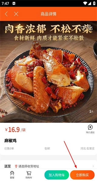 4、进入麻椒鸡商品详情页面,仔细核对商品信息无误后,点击“立即购买”按钮,即可完成商品选购流程。