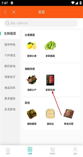 2、进入分类页面后,选择“海鲜肉类”分类,在该分类下找到“新鲜肉类”子分类,点击此选项即可进入对应的页面。
