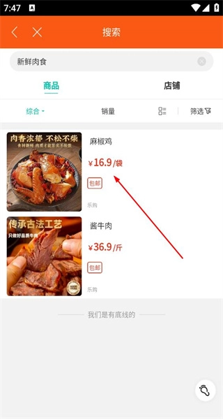 3、在新鲜肉类的商品列表里找到目标商品麻椒鸡,点击该商品,查看它所展示的价格等详情信息。