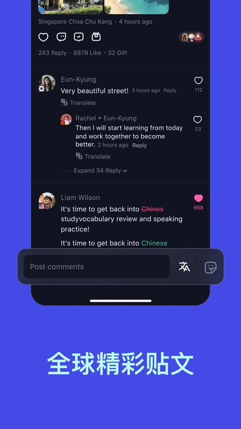 4、全球动态:在这里,你可以浏览来自世界各地用户分享的动态内容,内容覆盖语言、文化、美食等多个领域,让你无需出门就能开启一场精彩的“全球旅行”体验。