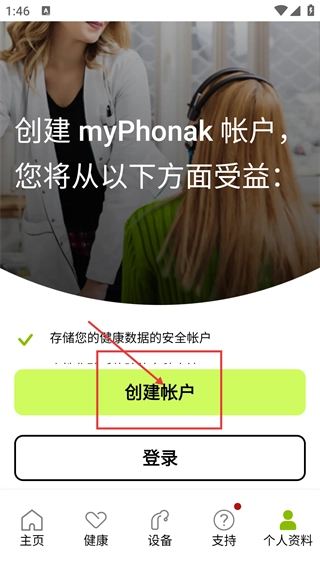 1、进入【myPhonak】相关界面后,若有创建账户的需求,点击【创建帐户】按钮,即可拥有存储健康数据的安全账户等相关权益。