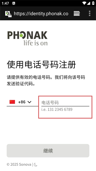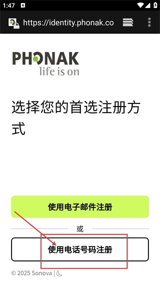 2、进入注册方式选择页面后,会看到【PHONAK】的标识,您可以根据自身需求,点击【使用电话号码注册】这一选项来确定注册途径。