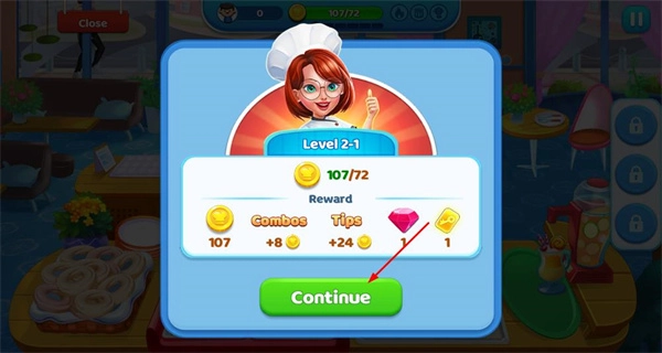 4、服务完成后,界面会弹出关卡结算的提示,你可以查看此次获得的金币和奖励道具,之后点击对应的按钮就能进入下一轮关卡。