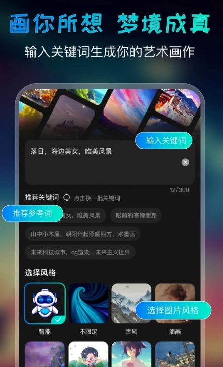 BeautyAI绘画能依据用户的指令与需求,自动生成不同风格的艺术作品。该软件运用深度学习算法和神经网络模型,通过学习分析海量艺术作品,能够模拟各类艺术家的风格与技巧,并将其融入用户的创作过程。用户仅需在软件里输入对绘画作品的文字描述,还能挑选多种绘画风格。不管是专业画家还是业余爱好者,都能在此收获乐趣与灵感。