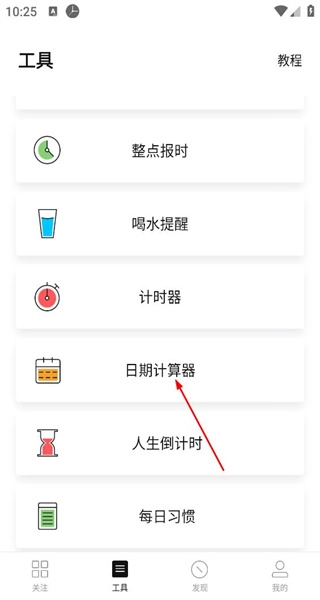 进入工具页面后,能看到整点报时、喝水提醒等功能,找到日期计算器选项并点击,即可进入对应的页面。