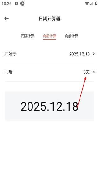4、切换至向后计算模式,确定开始日期后,设置向后推移的天数,页面便会呈现出对应的计算结果日期。