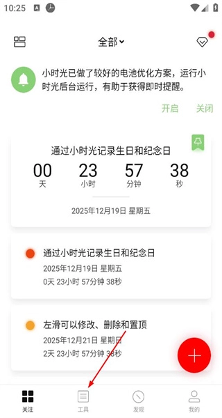 1、进入小时光首页,会看到纪念日记录和电池优化提示,点击底部对应的按钮,就能进入工具页面。