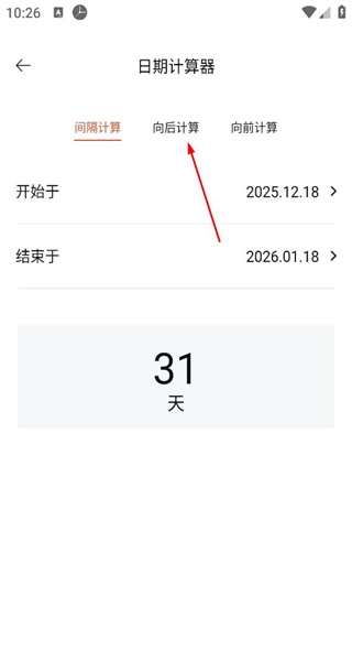 3、进入日期计算器页面后,可选择间隔计算的方向(向后或向前),设置好开始日期与结束日期,系统便能显示出两者之间的间隔天数。