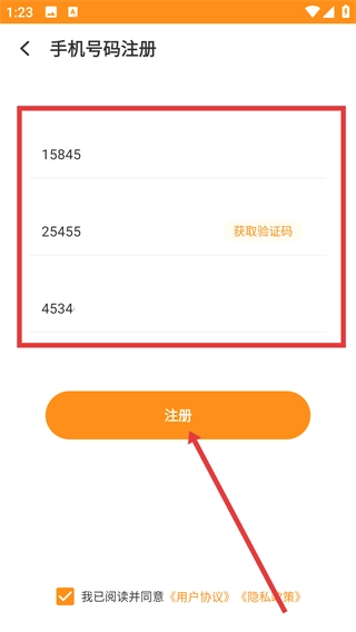 4、进入手机号码注册页面后,按顺序填写手机号、获取并输入验证码、设置密码,接着点击【注册】按钮,即可完成账号注册流程。