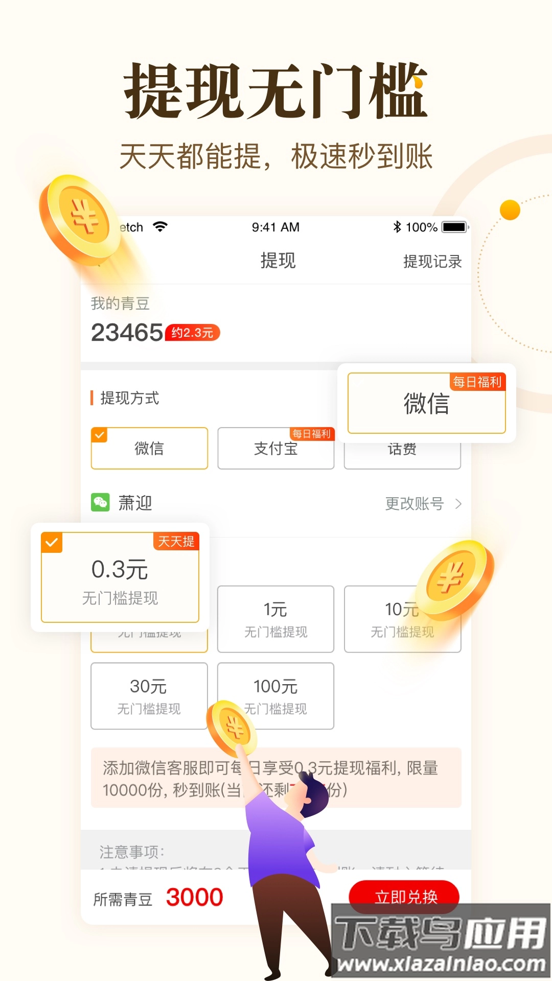 2.目前最低0.3元即可提现,新用户注册最高能获得10元现金红包。