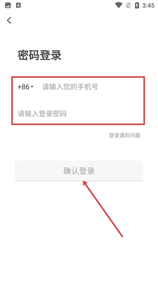 3、进入【密码登录】页面后,请依次填写【+86-请输入您的手机号】栏位和【请输入登录密码】栏位。