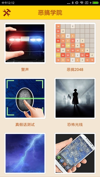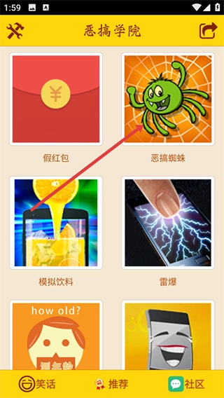 1、打开【恶搞学院】界面后,能选择【假红包】【恶搞蜘蛛】【模拟饮料】【雷爆】【how old?】等功能,从而启动相应的恶搞类互动操作。