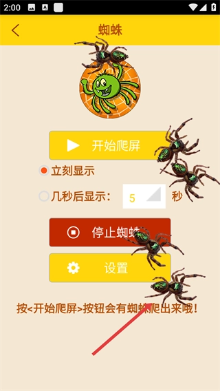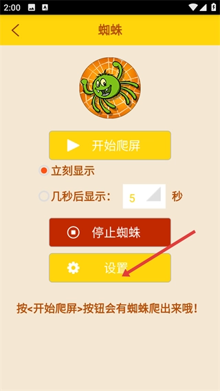 2、进入【蜘蛛】界面后,可选择【立刻显】或【几秒后显示】选项,点击【设置】按钮能够对蜘蛛的爬屏参数进行调整。