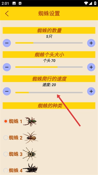 3、进入【蜘蛛设置】界面,能对【蜘蛛的数量】【蜘蛛个头大小】【蜘蛛爬行的速度】进行调整,也可以挑选不同的【蜘蛛的种类】来完成参数配置。