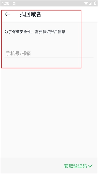 2、进入【找回域名】界面后,为确保账户安全,需要先验证账户信息。您可以在【手机号/邮箱】输入框中填写对应的信息,然后完成验证操作。