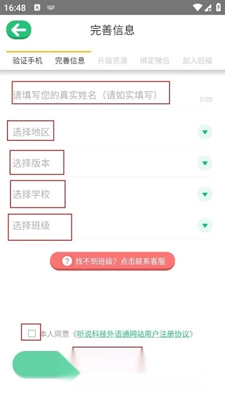 4. 进入信息完善页面后,请填写真实姓名,再依次选择所在地区、教材版本、学校和班级,最后勾选用户协议并点击“注册”按钮,即可完成操作。