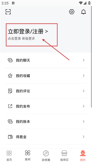 2、进入个人中心后,点击【立即登录/注册】按钮,完成该操作后,就能使用【我的聊天】-【我的收藏】等相关功能了。