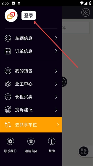1、在功能菜单界面,点击【登录】按钮,即可进入登录注册页面,之后便能使用【车辆信息】【订单信息】等各类功能。