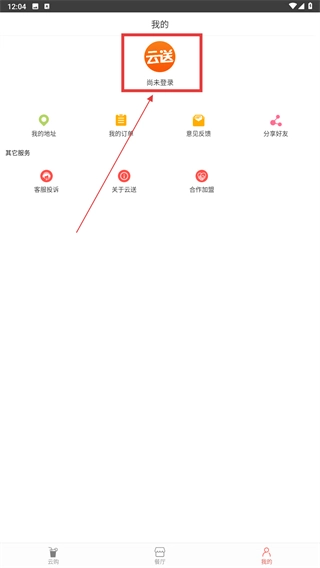 1、进入“我的”页面后,点击显示为【云送-尚未登录】的区域,即可跳转至登录界面,接下来需完成账号验证,以便正常使用地址管理、订单查询等相关功能。