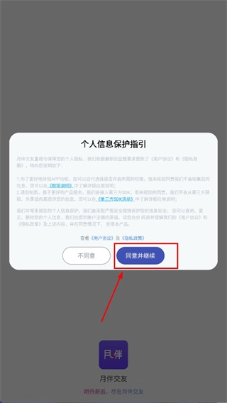 1、在【月伴交友】弹出的个人信息保护指引窗口中,点击【同意并继续】按钮,以此确认相关协议并进入应用。