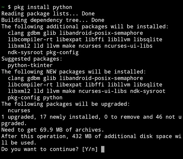 在 Termux 里输入 pkg install python 并按下回车键来安装 Python,此时会出现如图所示的内容。